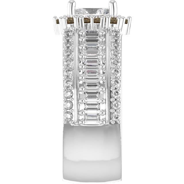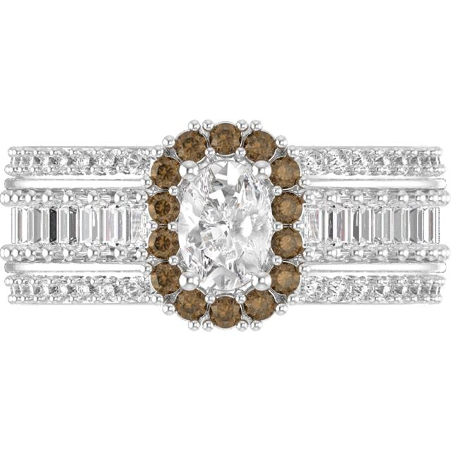 We built a low-set design with a chocolate diamond halo around the oval center stone and a baguette band that hits exactly the balance she described. The juxtaposition between the warm chocolate halo and the crisp baguettes is what makes it work.